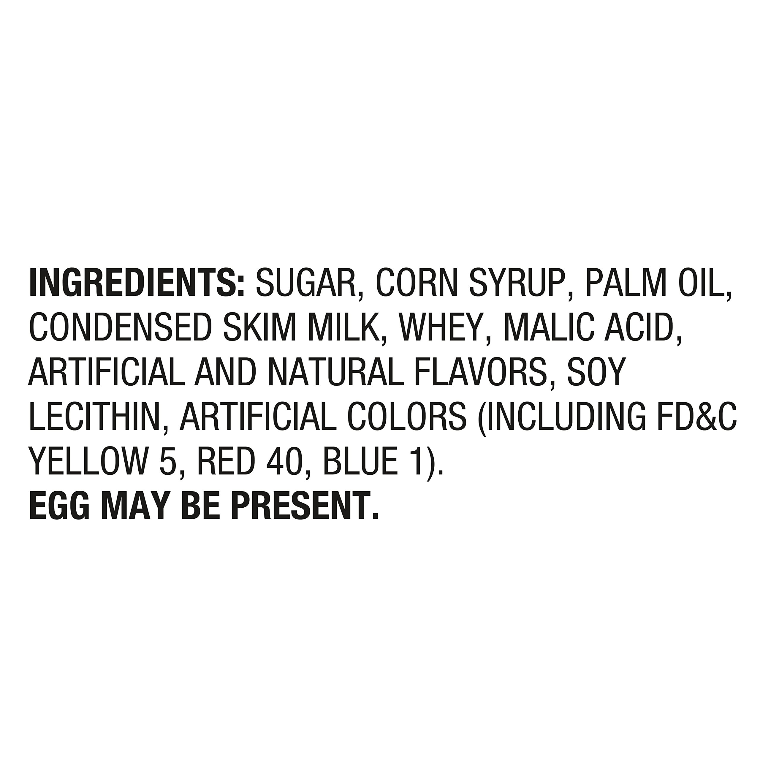 The Frooties Mega Mix contains sugar, corn syrup, palm oil, condensed skim milk, whey, malic acid, artificial flavor, soy lecithin, artificial colors (including FD&C red 40, blue 1, yellow 5, yellow 6).