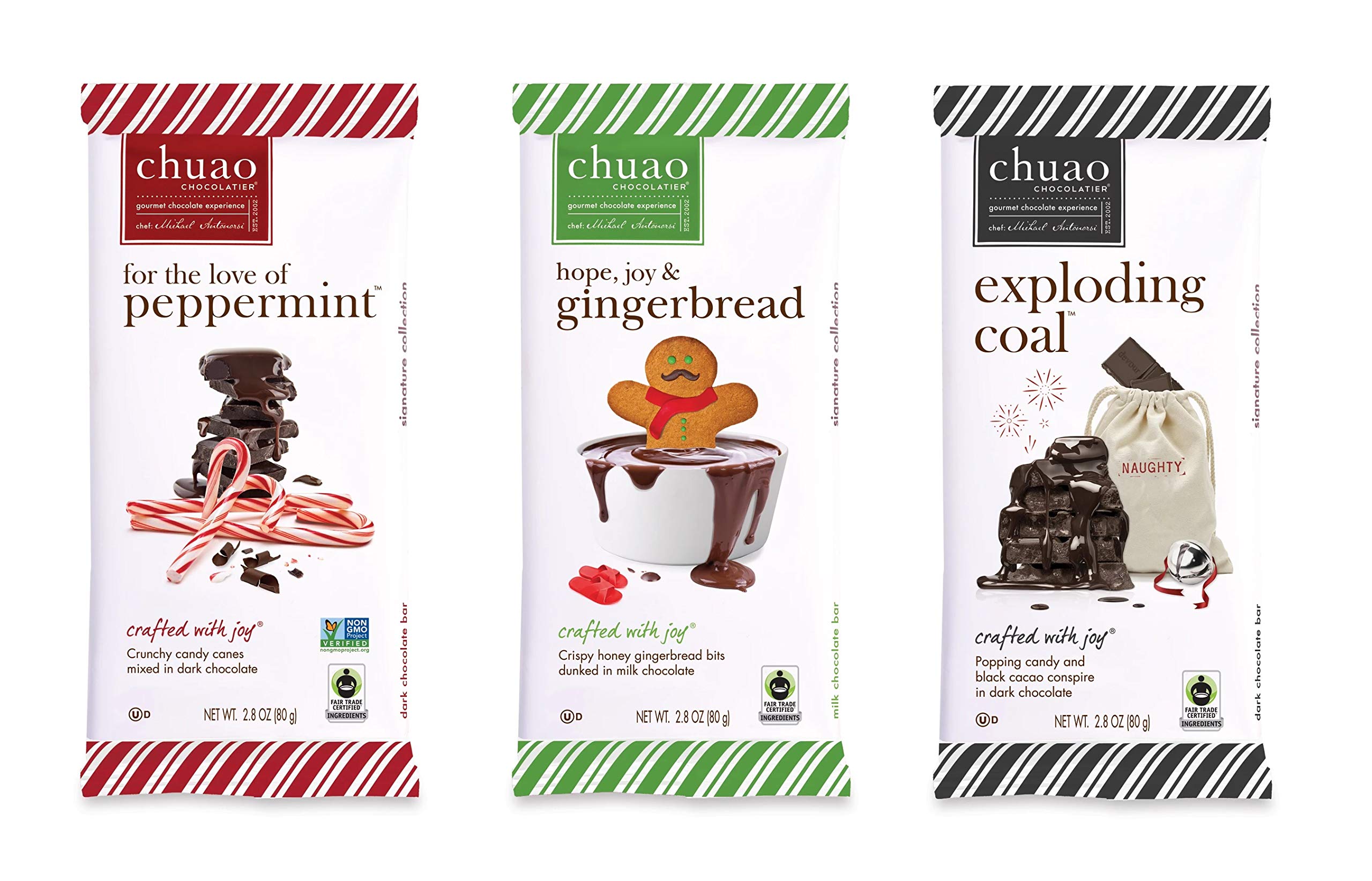 Celebrate joy this season with Chuao’s Christmas Holiday Variety 3 Pack! Includes For The Love of Peppermint, Hope, Joy & Gingerbread, and Exploding Coal bars.