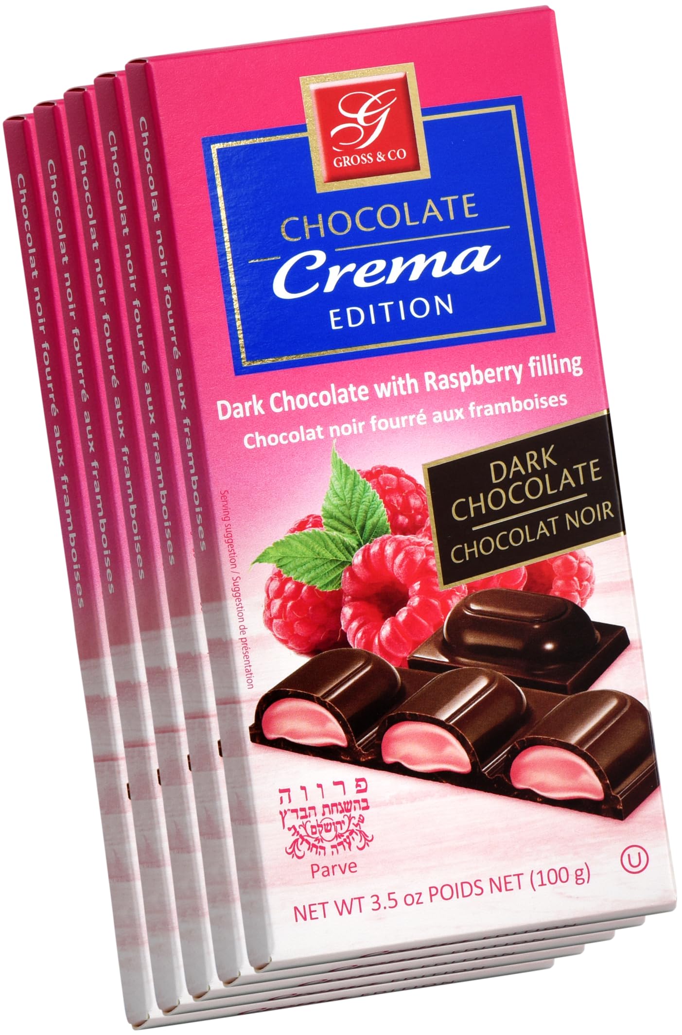Discover the exquisite flavor of the Crema Edition Dark Chocolate Bar with Raspberry Filling from GROSS & CO. This 5-Pack treat is a delightful combination of dairy chocolate and tangy Raspberry, perfect for indulging yourself or gifting to someone special.