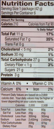 | Nutritional Information: | Each serving provides 210 calories, 7g of saturated fat (35% DV), 30mg of sodium (1% DV), and 21g of sugars. Treat yourself to this satisfying snack that is both indulgent and delicious. |