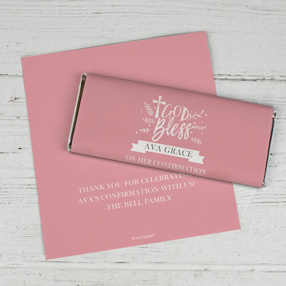 Make your celebration extra special with these personalized chocolate bar wrappers from Just Candy. Each pack comes with 25 wrappers featuring a beautiful Cross Pink God Bless design, perfect for 12 wrapped bars.